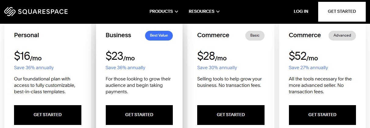 For Squarespace pricing, the cost starts at $16 per month for their cheapest plan called Personal. If you need to sell things online, the Business plan costs $23 per month and lets you set up a basic online store.