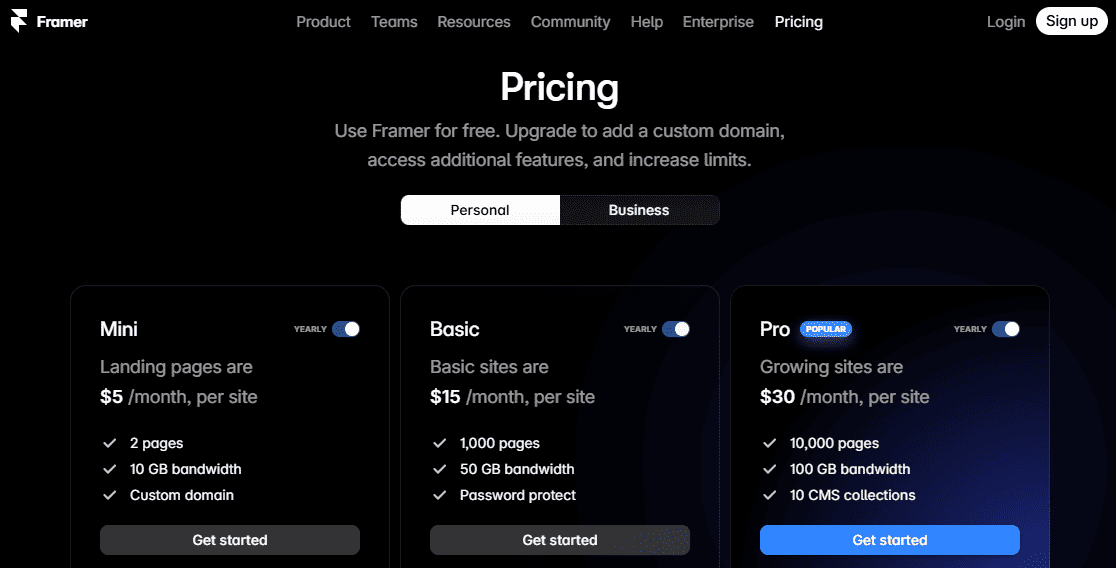 Framer has different price options starting at $5 per month for their Basic plan. They also have a Free plan that's great for personal projects or trying out the platform.